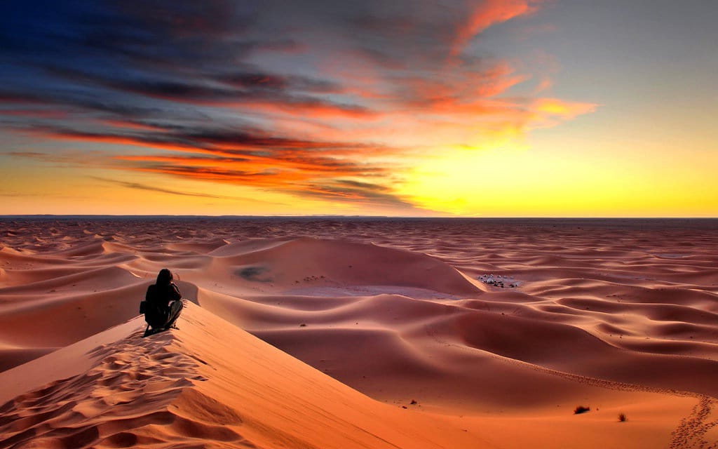 60 km south west of MHamid are the dramatic dunes of Erg Chigaga. An epic sandscape where takes your breath away. With a length of 40 km, 15 km width and 300m high, is the largest and wildest desert of Morocco. From M’Hamid, for visiting this desert, is advisable the presence of a professional local guide. Starting from the oasis of M’Hamid it is possibile to reach the dunes area, by 4×4 Off-road vehicle. This journey through these desert landscapes takes approximately 2 hours. The enthusiasts of nature and of slowness will prefer the ride on a dromedary’s back. Such a trip lasts from a few hours to several days. Due to its relatively difficult access, it remains less touristic than the Erg Chebbi, its small cousin but this is the reason also for keeping a wild and authentic beauty.